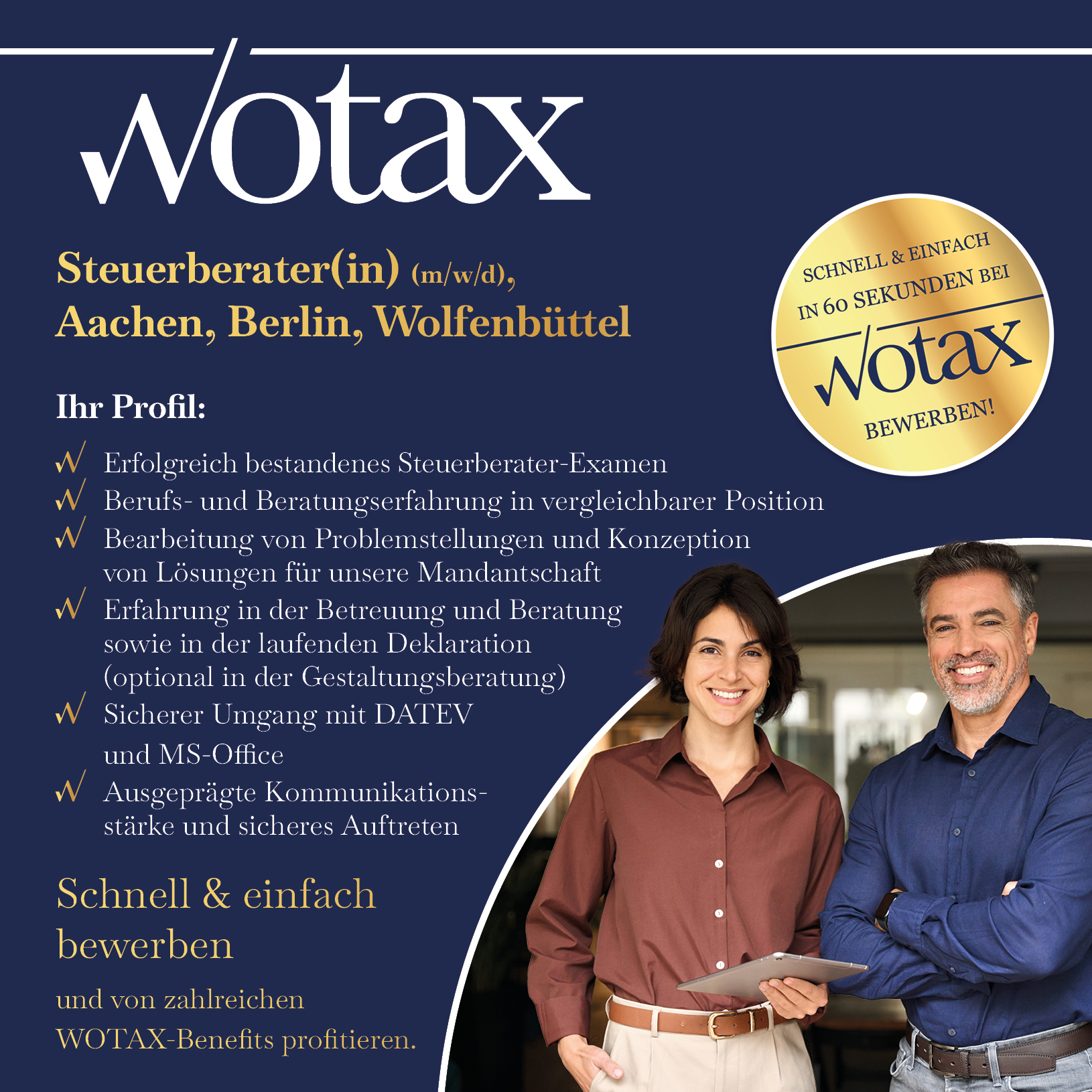 Als innovativer Partner im Bereich Steuerberatung und Wirtschaftsprüfung sucht WOTAX einen engagierten Steuerberater (m/w/d). Werden Sie Teil unseres dynamischen Teams und bringen Sie Ihre Expertise ein.